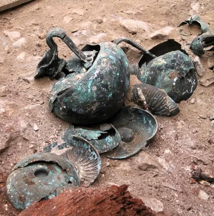 По завершению банкета все предметы были помещены в погребальную камеру. Некоторые чаши висели на гвоздях, вбитых в стены сруба. В захоронении сохранился даже кусок текстиля, в который был завернут один из металлических кувшинов. Затем над опечатанной камерой возвели огромный холм.