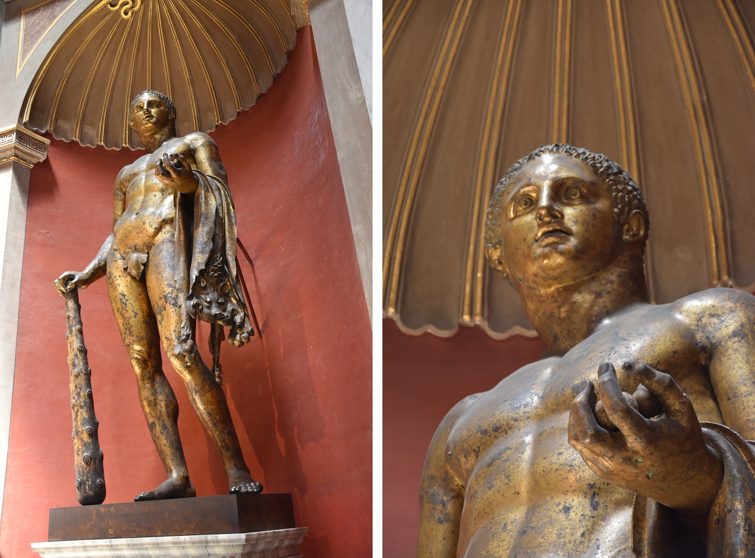 Атрибуты, характер мускулатуры торса, изгиб бедер свидетельствуют об обращении к образцам статуй Геракла, найденных в Риме на Бычьем Форуме и в районе театра Помпея. Обе статуи имеют колоссальный размер, они выполнены в бронзе, и восходят к греческим оригиналам IV в. до н.э. Если все фрагменты, найденные в Гераклее, происходят от одной статуи, то ее создатель, скорее всего, опирался на тот же тип, к которому относится статуя Геркулес Мастаи (Hercules Mastai, хранится в Ватиканских музеях — кстати, мы уже писали о недавней реставрации этого шедевра!), найденной вблизи театра Помпея. Правой рукой герой опирается на палицу, в левой руке держит «золотые» яблоки из сада Гесперид как напоминание о его известном подвиге. В ватиканской статуе с левой руки свисает шкура убитого Гераклом Немейского льва.