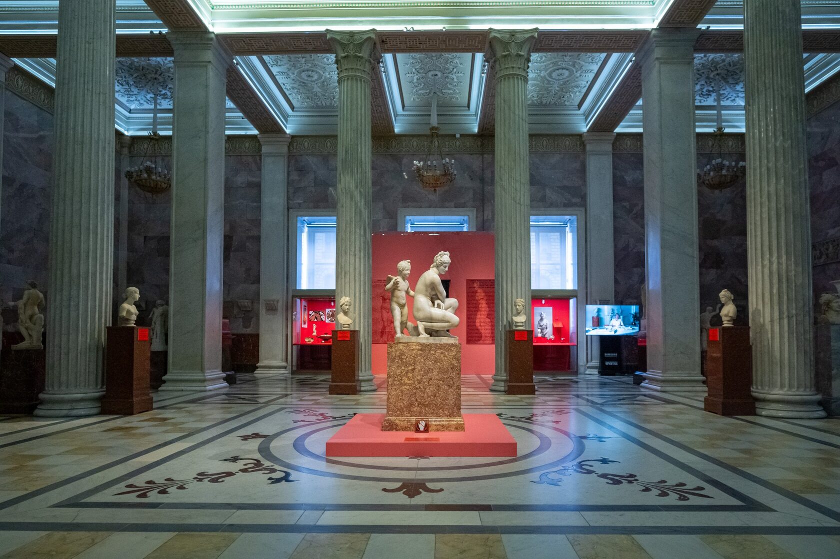 Мотив обнаженной женской фигуры на корточках получил дальнейшее развитие в эпоху эллинизма и Древнего Рима, воплотившись в многочисленных статуарных изображениях, выполненных в бронзе, терракоте и мраморе, в саму прекрасную Афродиту. Мраморные скульптуры «купающейся Афродиты», или «Афродиты на корточках», представлены во всех ведущих музеях мира, и, конечно, в Государственном Эрмитаже. Приобретенная в 1861 году у маркиза Кампана скульптурная группа Афродита с Эротом стала центральным экспонатом выставки.